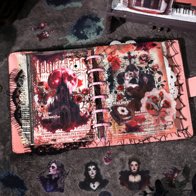 Night Falls Stickers captures the quiet magic of the evening sky. Featuring moonlit silhouettes, deep navy tones, and softly glowing details, it brings a serene nighttime atmosphere to your journals. Perfect for mood pages, dream diaries, or creating calming visual stories inspired by the beauty of dusk.