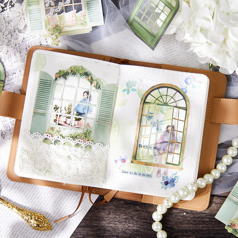 The Floral Window Dream weave sticker set blends blooming flowers with elegant window motifs and soft light. Delicate details and dreamy colors create a poetic, romantic atmosphere. Perfect for decorating journals, planners, and crafts with layered depth, gentle nostalgia, and a sense of dreams quietly unfolding.