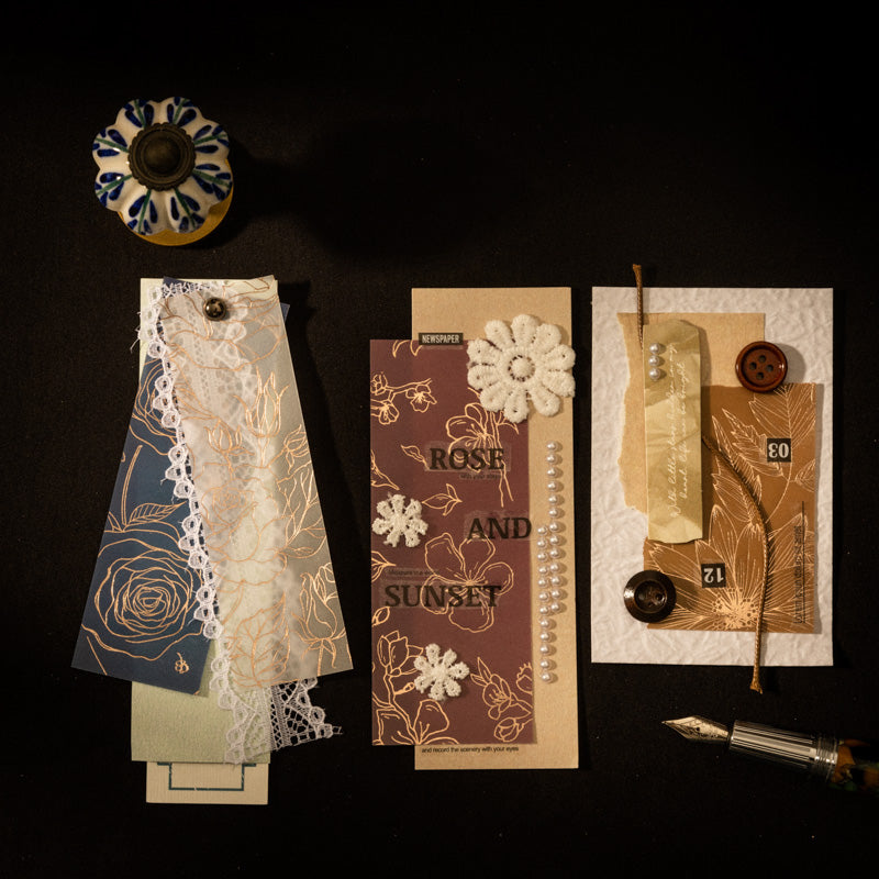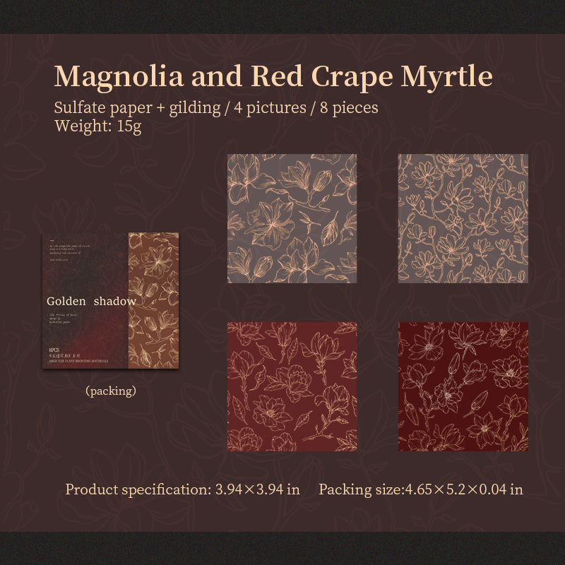 The Golden Petal Shadow Paper features elegant floral silhouettes infused with soft golden hues. Its delicate texture and shimmering details evoke a timeless charm, perfect for journaling, scrapbooking, and creative layering. Each sheet captures the gentle glow of sunlight filtering through blossoms.