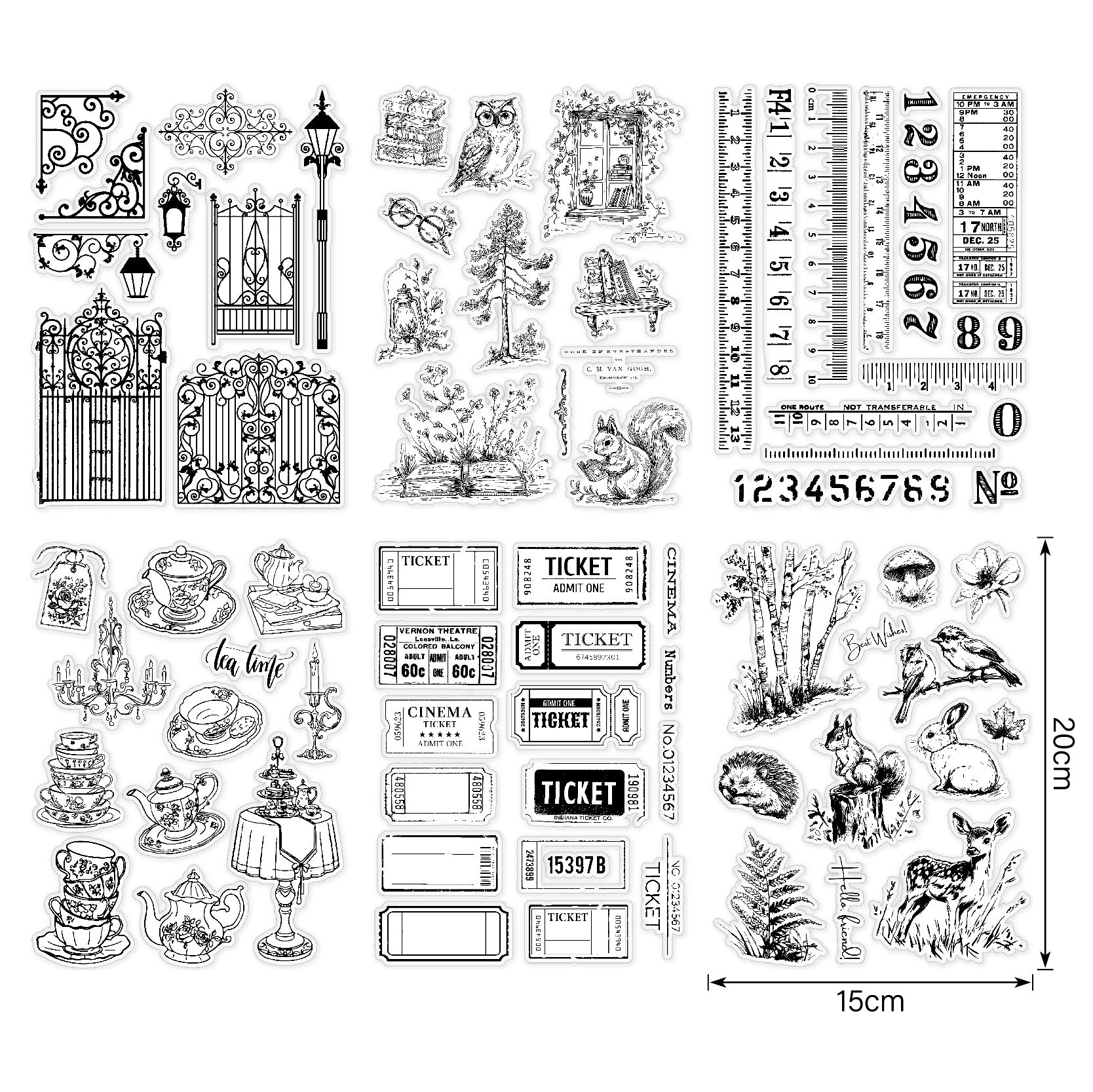 Clear silicone stamps with fine details, perfect for journaling, card making, and DIY crafts. Easy to use and clean.