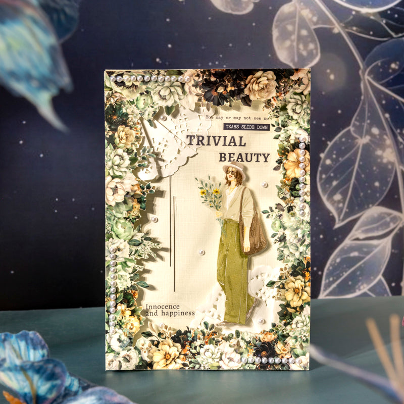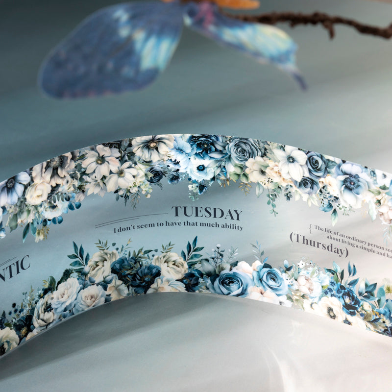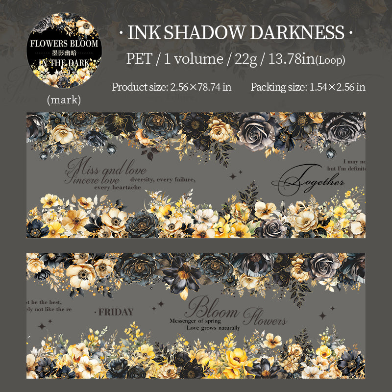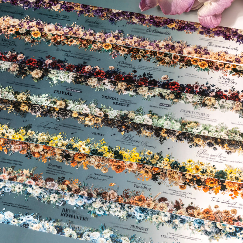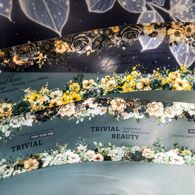 This tape features blooming flowers under a mysterious night sky. Deep tones and golden accents create a romantic, dreamy mood—perfect for adding elegance to your journals and crafts.