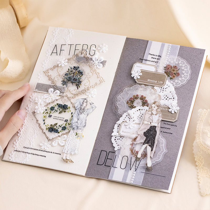 The Glayed Tulle Lace Stickers set features translucent layers inspired by glass-like textures and flowing sheer fabric. With soft gradients, luminous effects, and delicate patterns, each piece adds an airy elegance to journals and crafts. Perfect for creating dreamy, layered layouts filled with light, softness, and refined beauty.